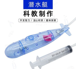 做个小模型,材料很简单,找个塑料瓶,最好是细长的,再准备一根软管,几个注射器,还有橡皮泥和胶水,塑料瓶当艇身,软管用来通气和排水,注射器就是动力泵,橡皮泥用来配重,调整重心,让模型在水里保持平衡。