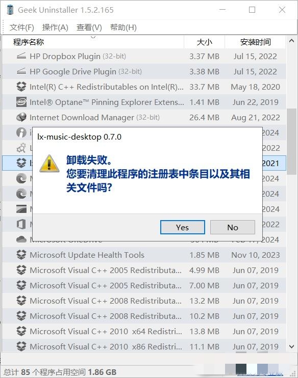 2、发现卸载失败,这里提示清除残留注册表及相关文件,根据提示选择“Yes”。