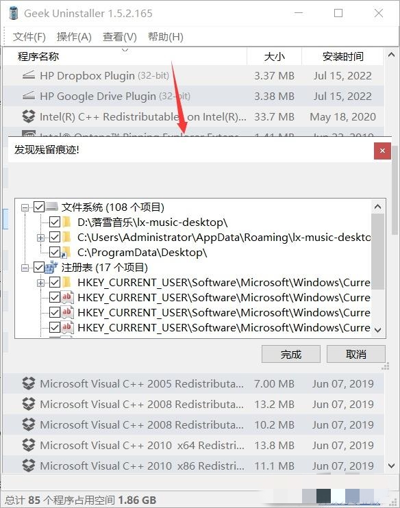 3、确认后出现扫描出来的注册表文件,点击“完成”消除痕迹。
