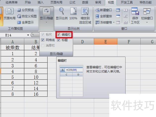 点击显示/隐藏下拉按钮,选择编辑栏并勾选。