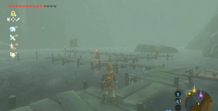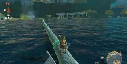 当然,你也可以直接游泳,按住游泳键,林克就会向前游,不过,游泳消耗精力,精力条有限,如果河流很宽,可能游不到对岸,所以,游泳前要估算距离,或者,吃增加精力的食物。