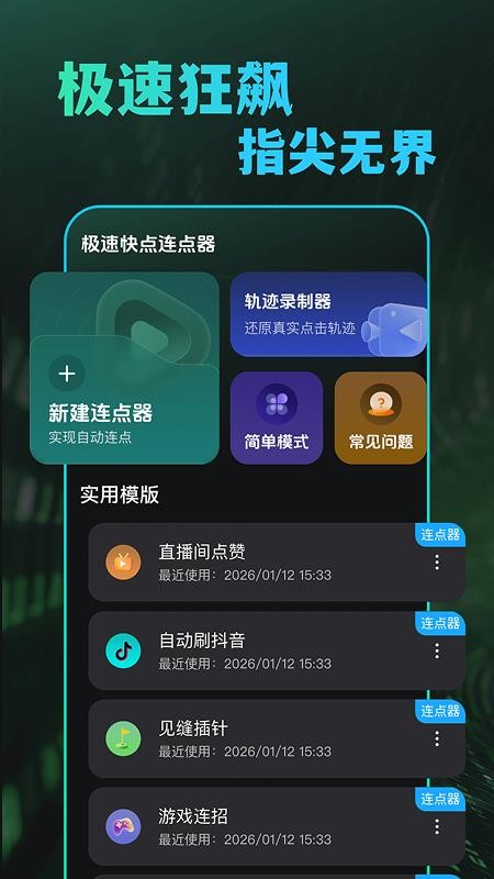 极速快点连点器app是一款为用户提供自动点击器工具的应用软件,软件支持用户一键新建连点器,方便用户随时随地的点击,有效进行自动化点击,可以对各类重复性任务来进行点击操作,轻松解放用户的双手,快捷完成相关的任务点击,以便可以简单点击操作。平台还支持用户智能连点,进行多场景的点击操作,更好的进行效率加速,以此来极速点击,从而可以批量操作,轻松体验简单模式的点击;此外,极速快点连点器客户端还支持用户对相关的常见问题进行查阅,随时解答常见问题,一键查看掌握,有需要的用户就赶紧来本站下载使用吧!