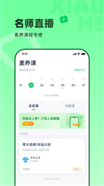 设有名师直播与素养课模块,通过日历式课程安排与阶段化课程设计,帮助学生进行长期、系统的素养与学科能力提升。