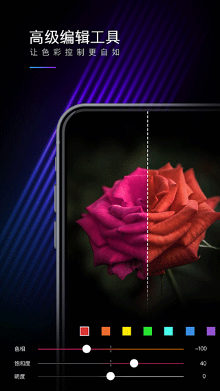 2、强大的图片编辑功能。除15种基础调节工具外,还支持曲线、色调分离、HSL等高级调色工具。