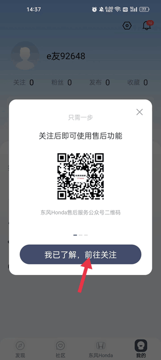 3、点击允许并进入扫码关注东风honda售后服务公共号,然后返回绑定点击允许进入;