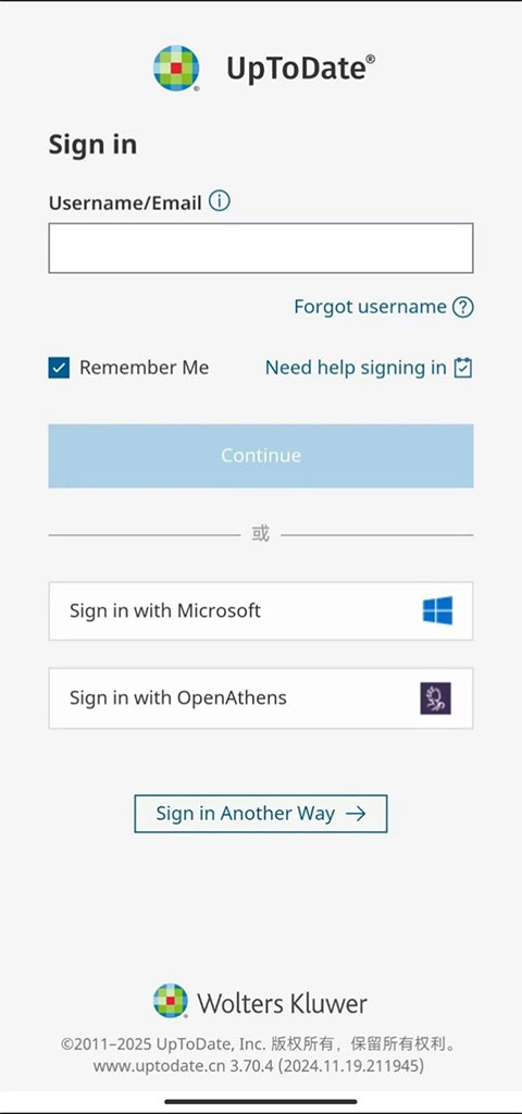 打开 UpToDate App,输入注册的用户名,勾选同意协议,点击 “Continue”,再输入密码即可登录。