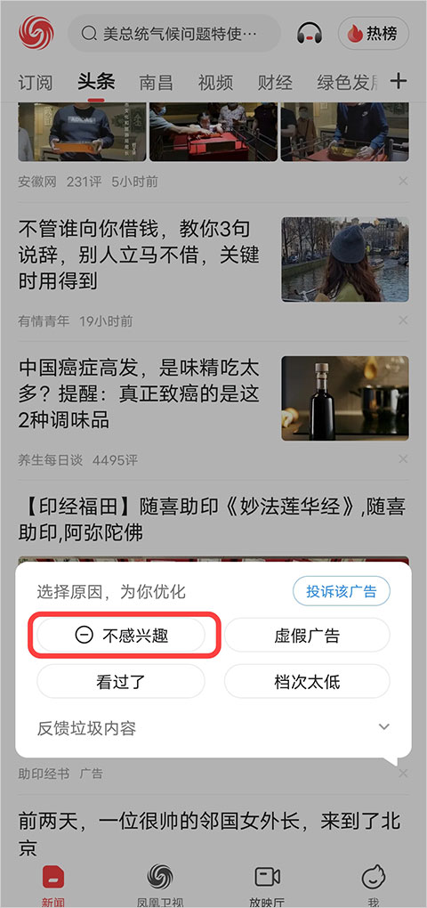 下拉一下切换兴趣推荐模式,算法推荐给你喜欢看的内容,不感兴趣直接点叉屏蔽,用得越久凤凰越懂你。