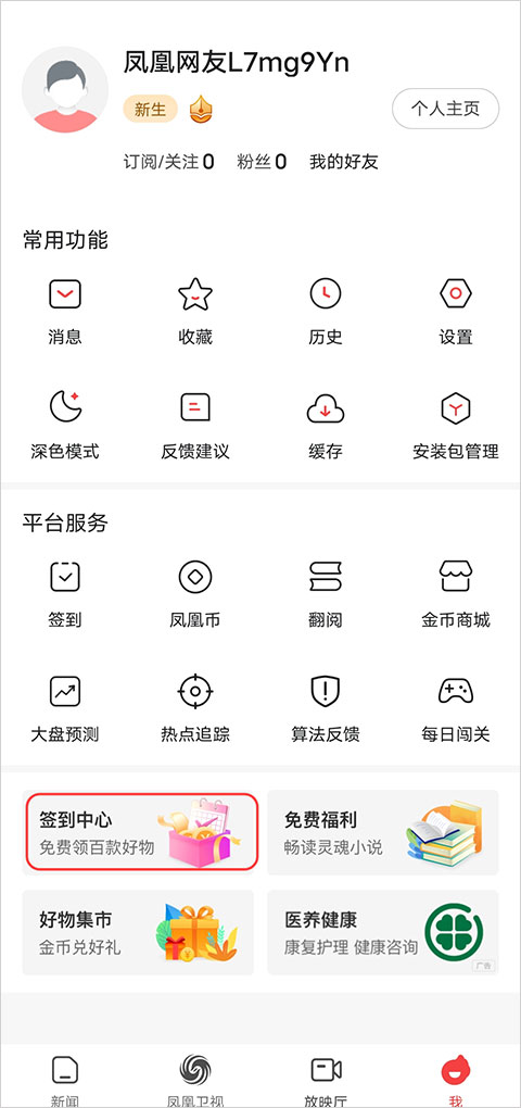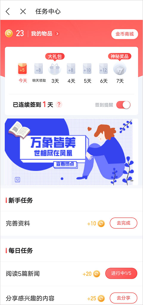1、用户可以通过“我的”界面的“签到中心”里进行阅读新闻、订阅签到、分享新闻等任务获得金币。